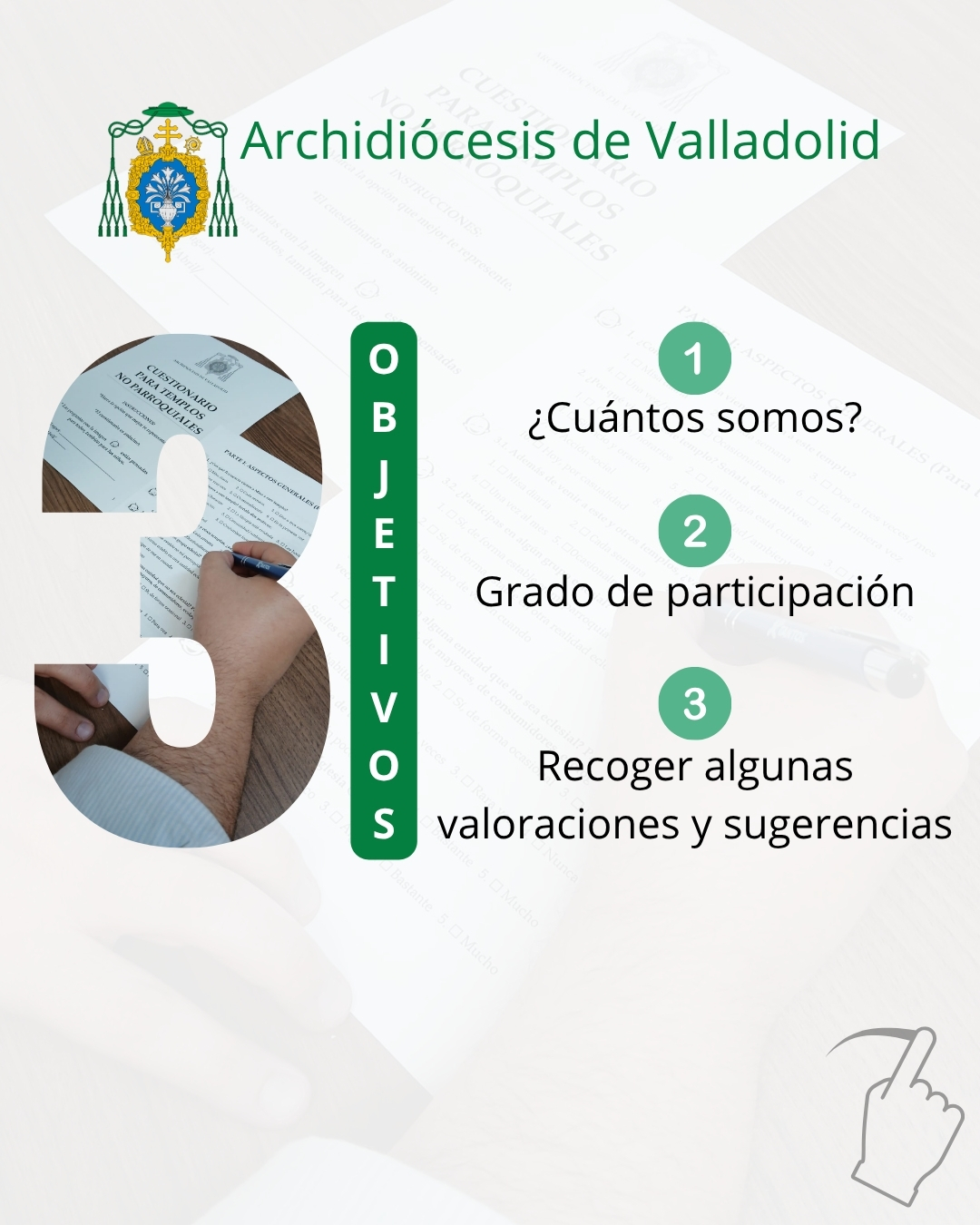 Esta acción consiste en una encuesta con un triple objetivo, como indicó el propio prelado: saber "cuántos somos y cuáles son también nuestras características", medir el "grado de participación" en la Eucaristía del domingo y en otras actividades eclesiales y, por último, recoger "algunas valoraciones" y "nuestros anhelos".