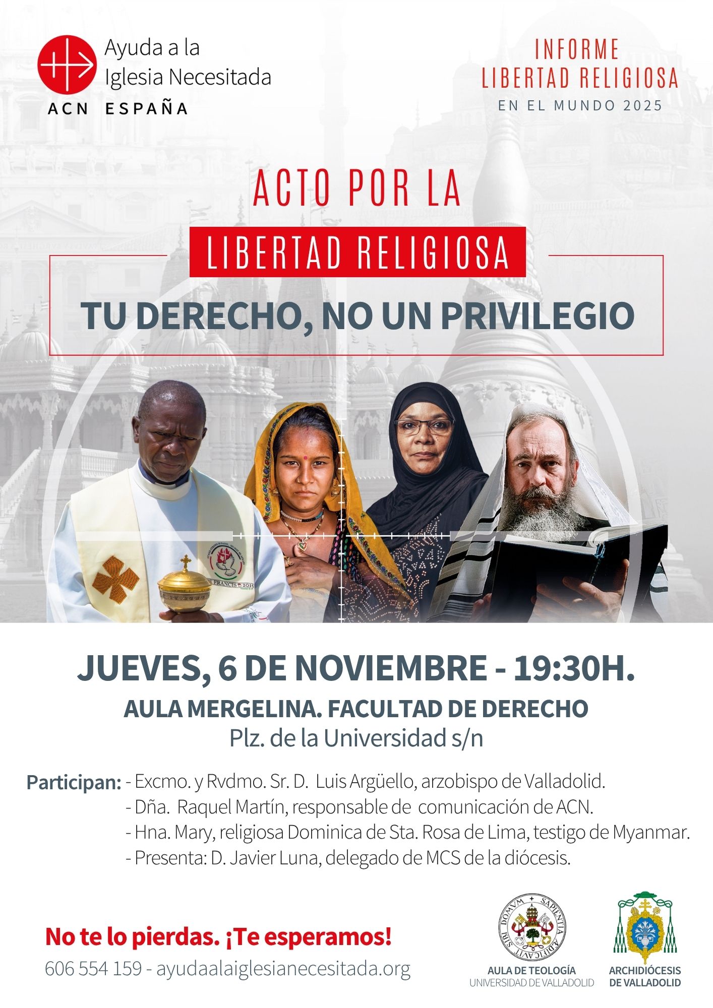 La fundación pontificia Ayuda a la Iglesia Necesitada (ACN España) presentará este jueves, 6 de noviembre, en el Aula Mergelina de la Facultad de Derecho de la Universidad de Valladolid su Informe Libertad Religiosa en el Mundo 2025.