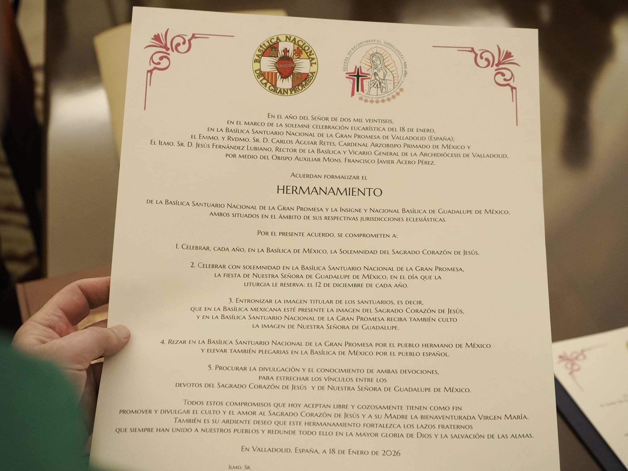 La firma se llevó a cabo en la sacristía de la Basílica-Santuario Nacional de la Gran Promesa el 18 de enero, tras la celebración de la Eucaristía. Posteriormente, el cardenal Aguiar mantuvo un encuentro con fieles mexicanos y de otros países de Hispanoamérica que viven su fe en la Iglesia vallisoletana.