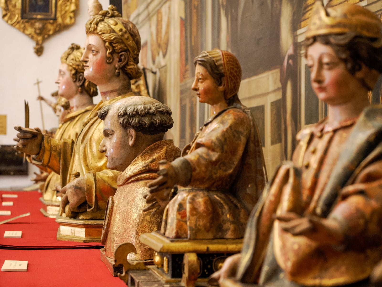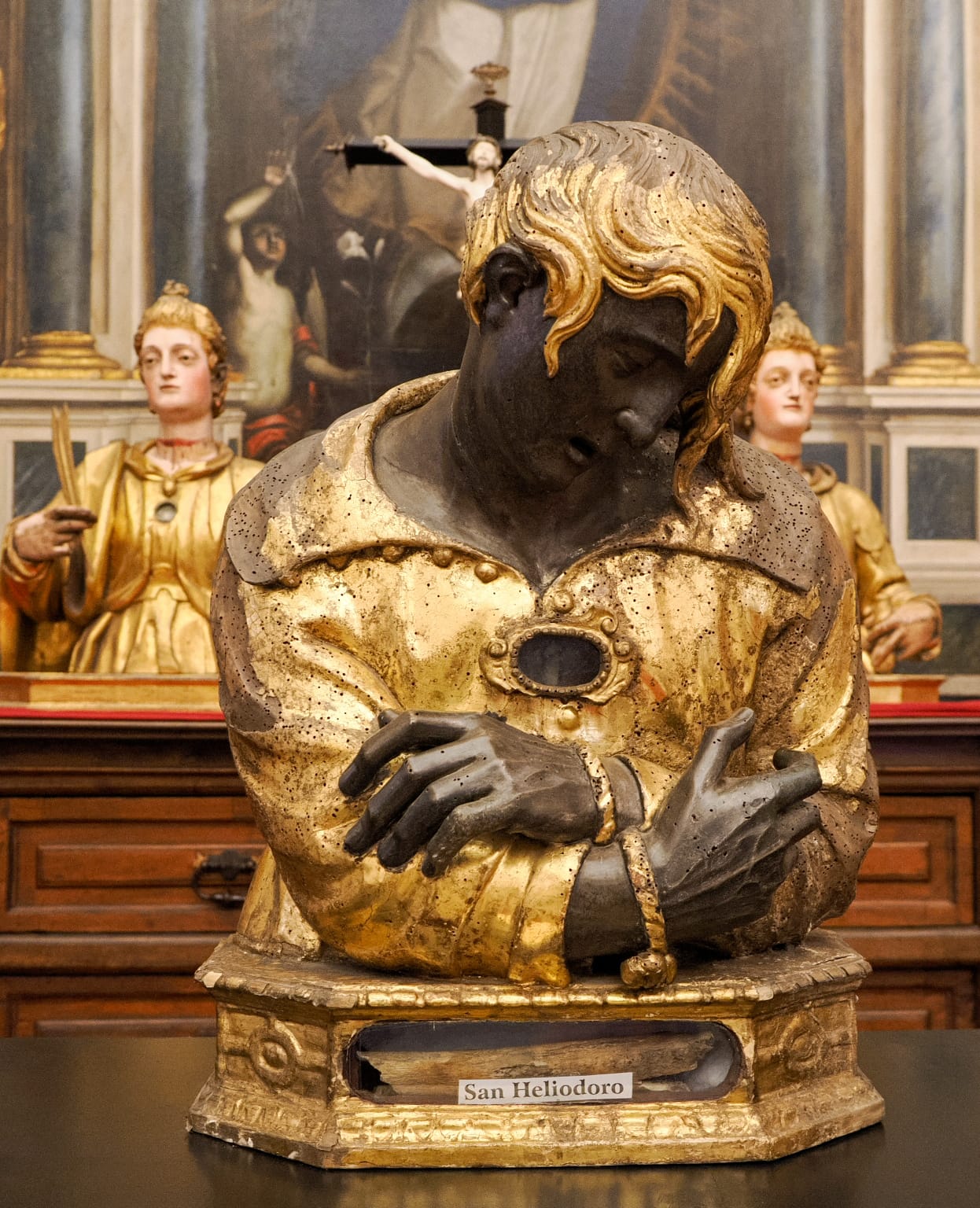 Losa ha detenido su atención en el relicario más importante que se puede contemplar en la muestra, el de San Heliodoro, obra de Giovan Battista Gallone y que destaca ante las demás por el oscurecimiento de la cara y de las manos, debido a la oxidación del pan de plata utilizado para la creación de la pieza. Para después señalar, a Adrián Álvarez, maestro de Gregorio Fernández, como el principal escultor de esta muestra, con los bustos de Santa Lucía, Santa Caterina o Santa Mónica.