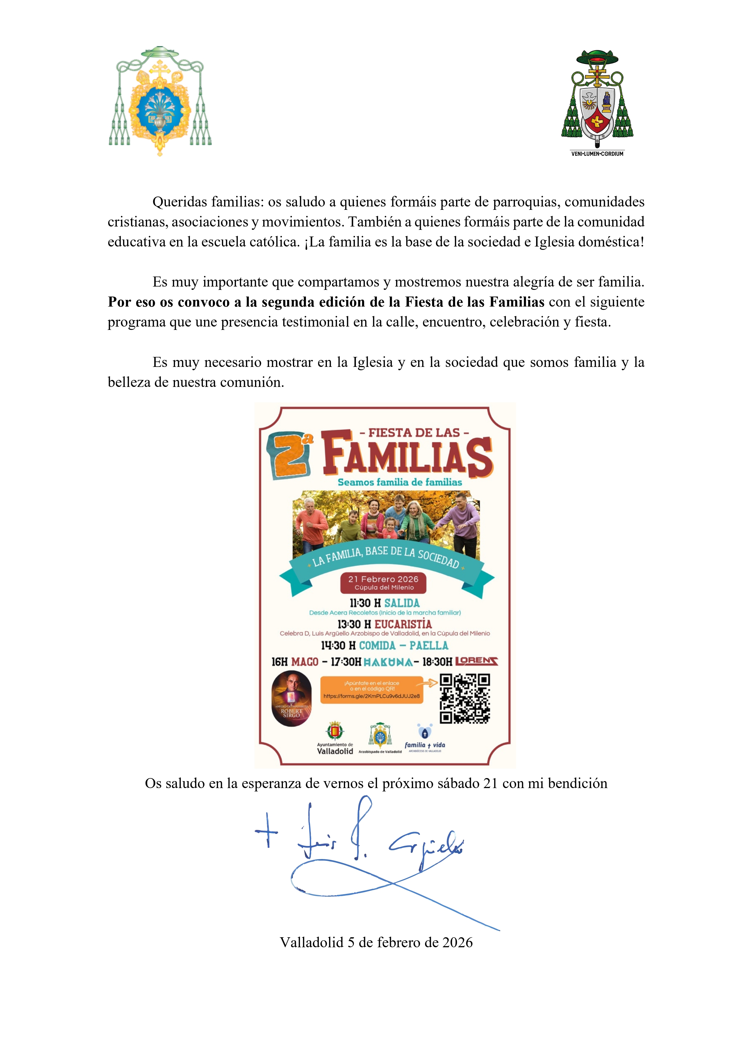 El Arzobispo de Valladolid, monseñor Luis Argüello, ha dirigido una carta animando a participar en la segunda edición de la Fiesta de las Familias “a quienes formáis parte de parroquias, comunidades cristianas, asociaciones y movimientos”, así como “a quienes formáis parte de la comunidad educativa en la escuela católica”.