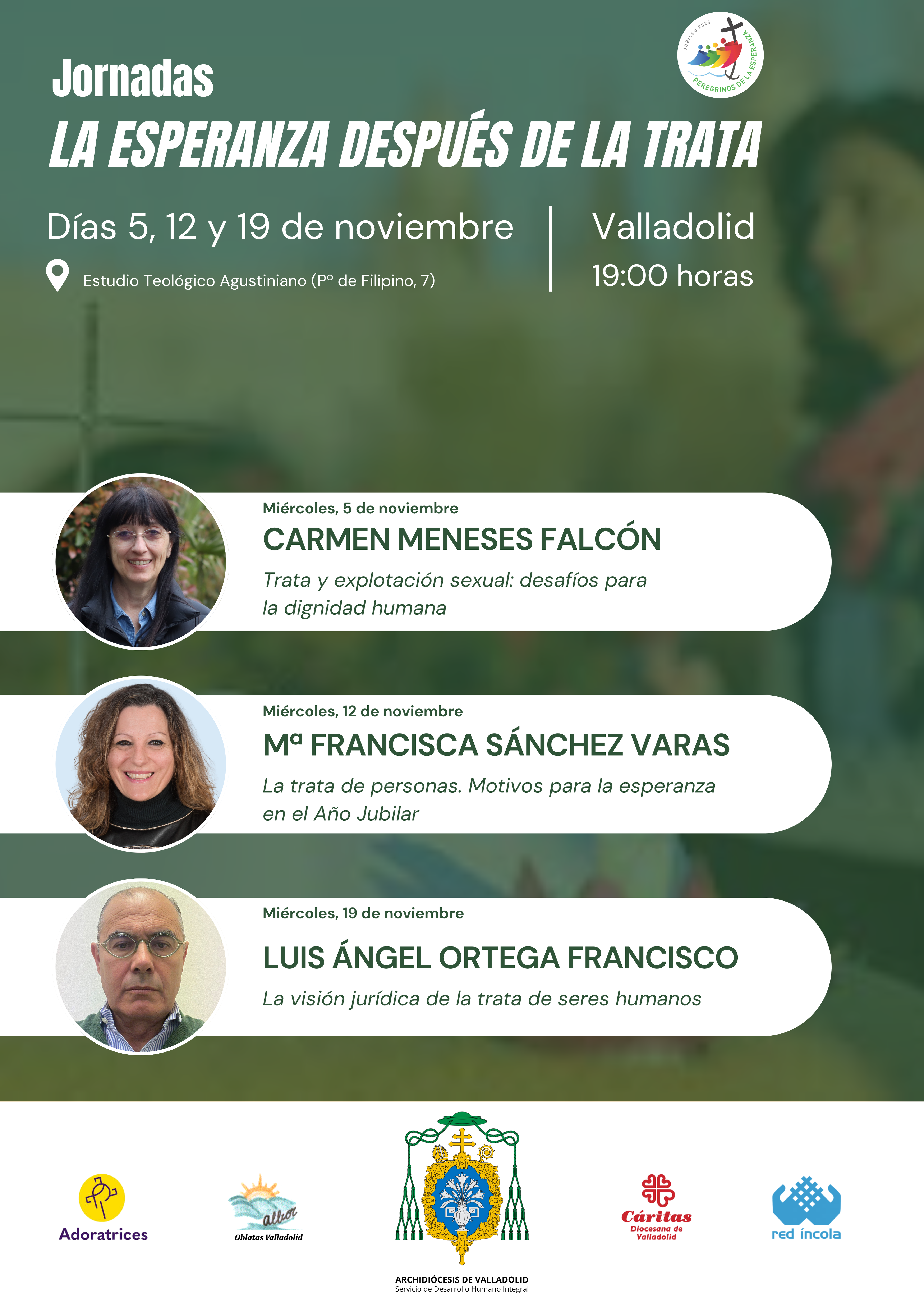Por último, los días 5, 12 y 19 de noviembre, a las 19:00 horas, las instalaciones del Estudio Teológico Agustiniano, en Valladolid, acogerán las jornadas ‘La esperanza después de la trata’. En este ciclo de conferencias intervendrán Carmen Meneses, profesora e investigadora de la Universidad Pontificia Comillas; María Francisca Sánchez, directora del Secretariado de la Subcomisión Episcopal para las Migraciones y Movilidad Humana de la CEE; y, por último, Luis Ángel Ortega, fiscal Provincial del Juzgado de Instrucción Nº 4 de Valladolid.
