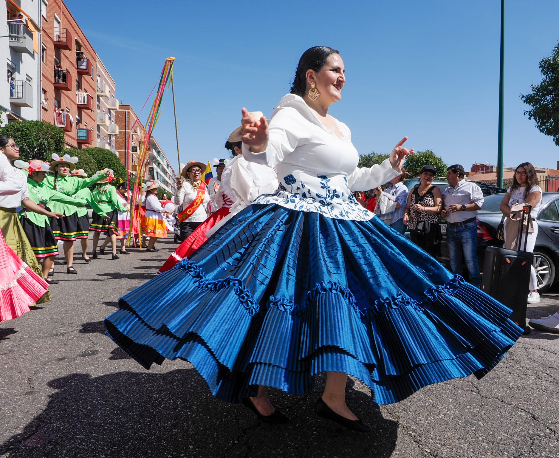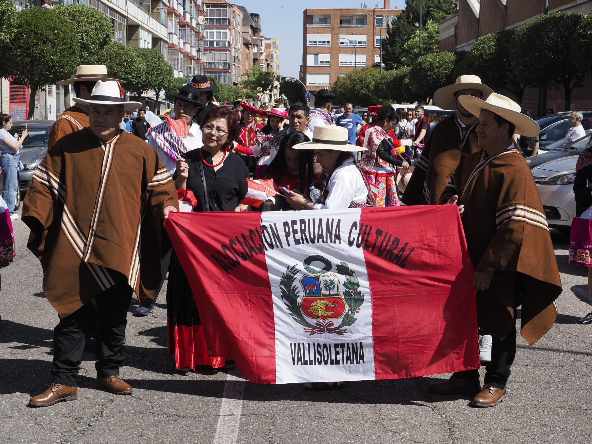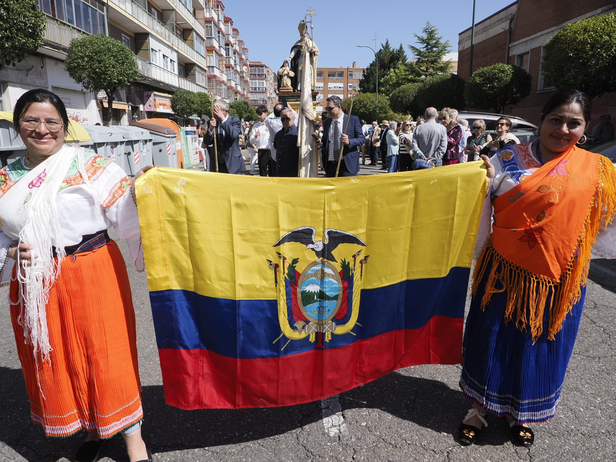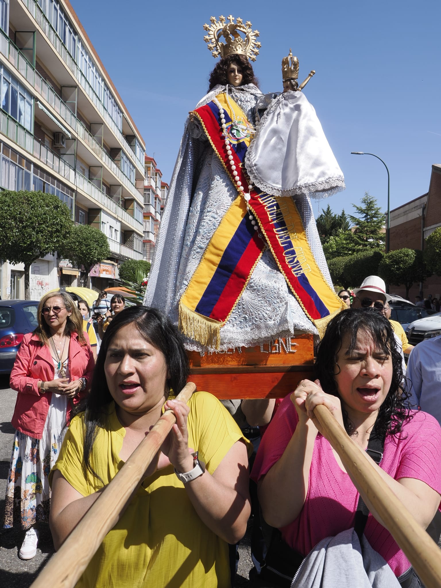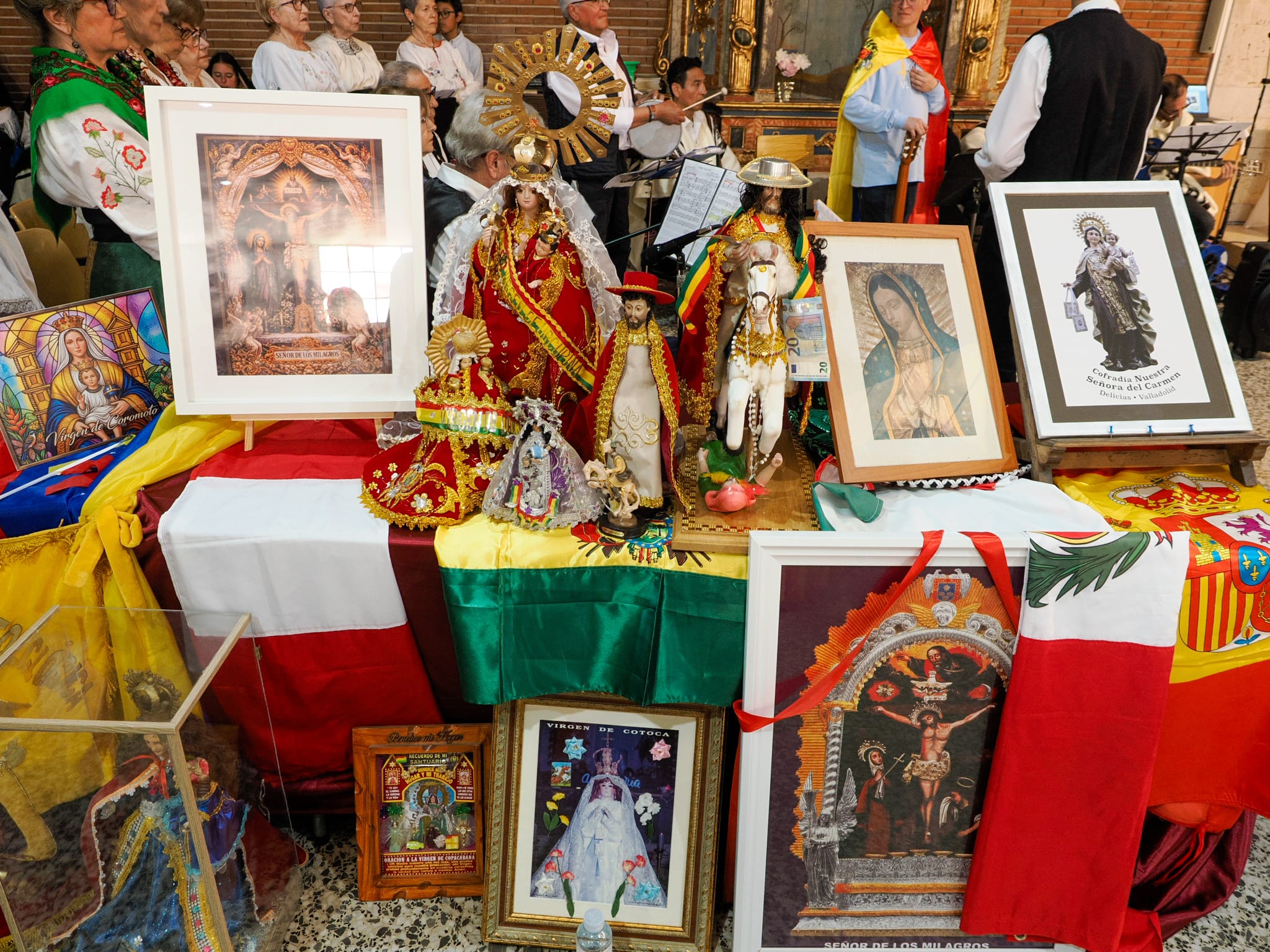 Casi dos horas de cortejo procesional en el que convivieron lo mismo la dulzaina, el tamboril, los trajes y las danzas propias del folclore castellano del Grupo Mies y Barro, con las banderas, coloridas vestimentas, cintas, penachos, sones y bailes autóctonos de Perú, Ecuador, México, Colombia, Bolivia, Venezuela y Ecuador, representados por distintos colectivos y asociaciones. Una procesión que unió a la población migrante de origen hispanoamericano, a las comunidades parroquiales de Valladolid y de Mayorga y también a las cofradías de Nuestra Señora del Carmen y de la Exaltación de la Santa Cruz y Nuestra Señora de los Dolores, erigidas canónicamente en este popular barrio vallisoletano.
