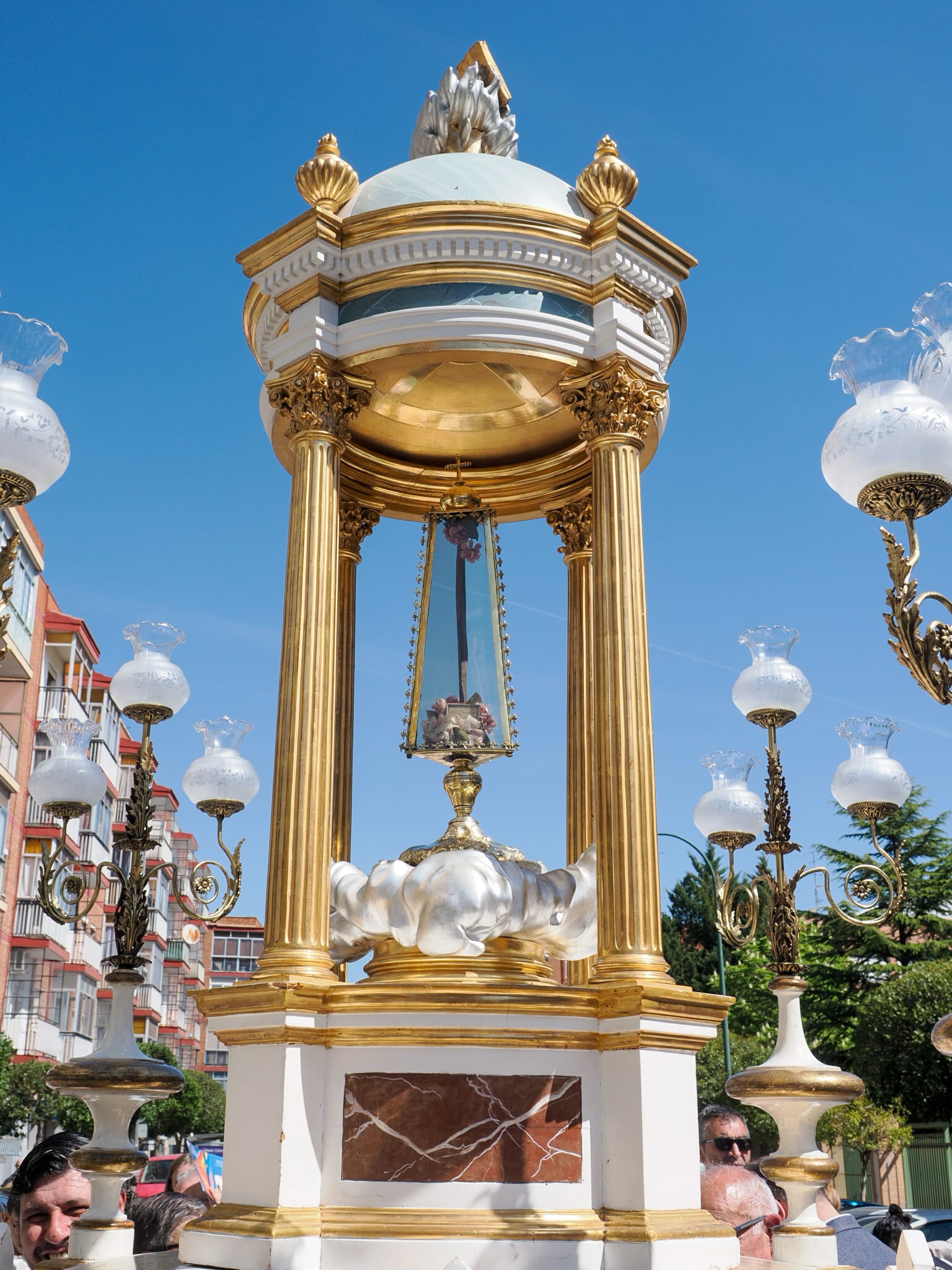 Cerca de la una del mediodía llegaba la imagen de Santo Toribio de Mogrovejo a la Parroquia que lleva su nombre en Las Delicias. Desde hacía una hora antes, el goteo de fieles había sido una constante. Muchos de ellos de avanzada edad, pero que igualmente no querían perderse este hito para la comunidad parroquial y para el conjunto de la Archidiócesis. Los portadores del Santo tuvieron que bajar a pulso las andas hasta, prácticamente, rozar el suelo para salvar la estrechez de la puerta del templo. Y al traspasar el dintel de la puerta que da acceso a la nave central, la Iglesia, que se mantuvo llena, con gente de pie tanto dentro como en la calle durante la celebración de la Eucaristía, estalló en aplausos al ver entrar la imagen y la reliquia de Santo Toribio de Mogrovejo a su templo vallisoletano.