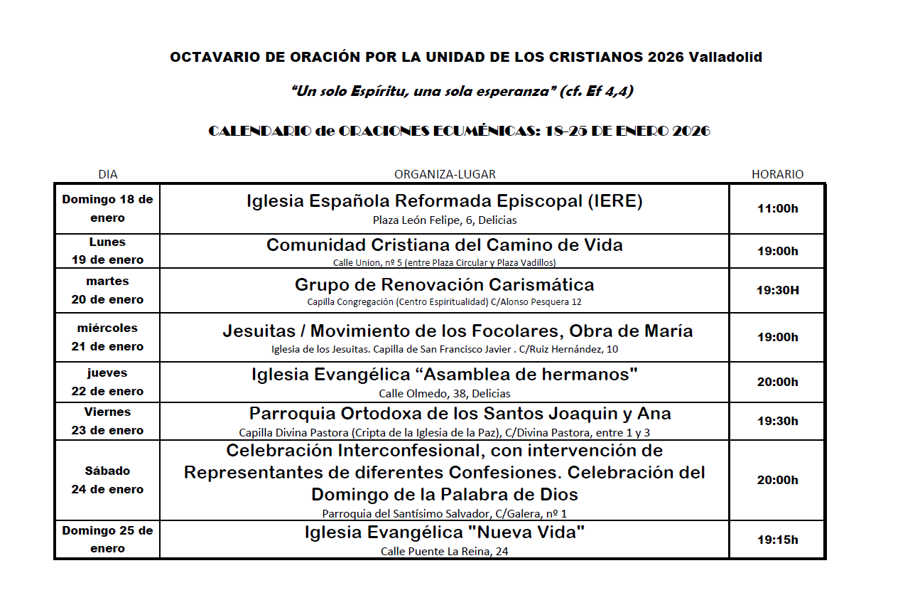 La Archidiócesis de Valladolid secunda cada año la Semana de Oración por la Unidad de los Cristianos con varios actos ecuménicos con el fin de orar por la restauración de la unidad visible de la Iglesia. Las celebraciones comienzan en la jornada del domingo 18 de enero, con la Iglesia Reformada Episcopal (IERE), a las 11:00 h. El lunes 19, la Comunidad Cristiana del Camino de Vida será la encargada de animar la celebración a partir de las 19:00h. El martes, 20 de enero, a las 19:30 h, la Capilla de la Congregación acogerá la oración preparada por el Grupo de Renovación Carismática. Mientras que, al día siguiente, la cita tendrá lugar a las 19:00 h en la Iglesia de los Jesuitas con el Movimiento de los Focolares, Obra de María.
