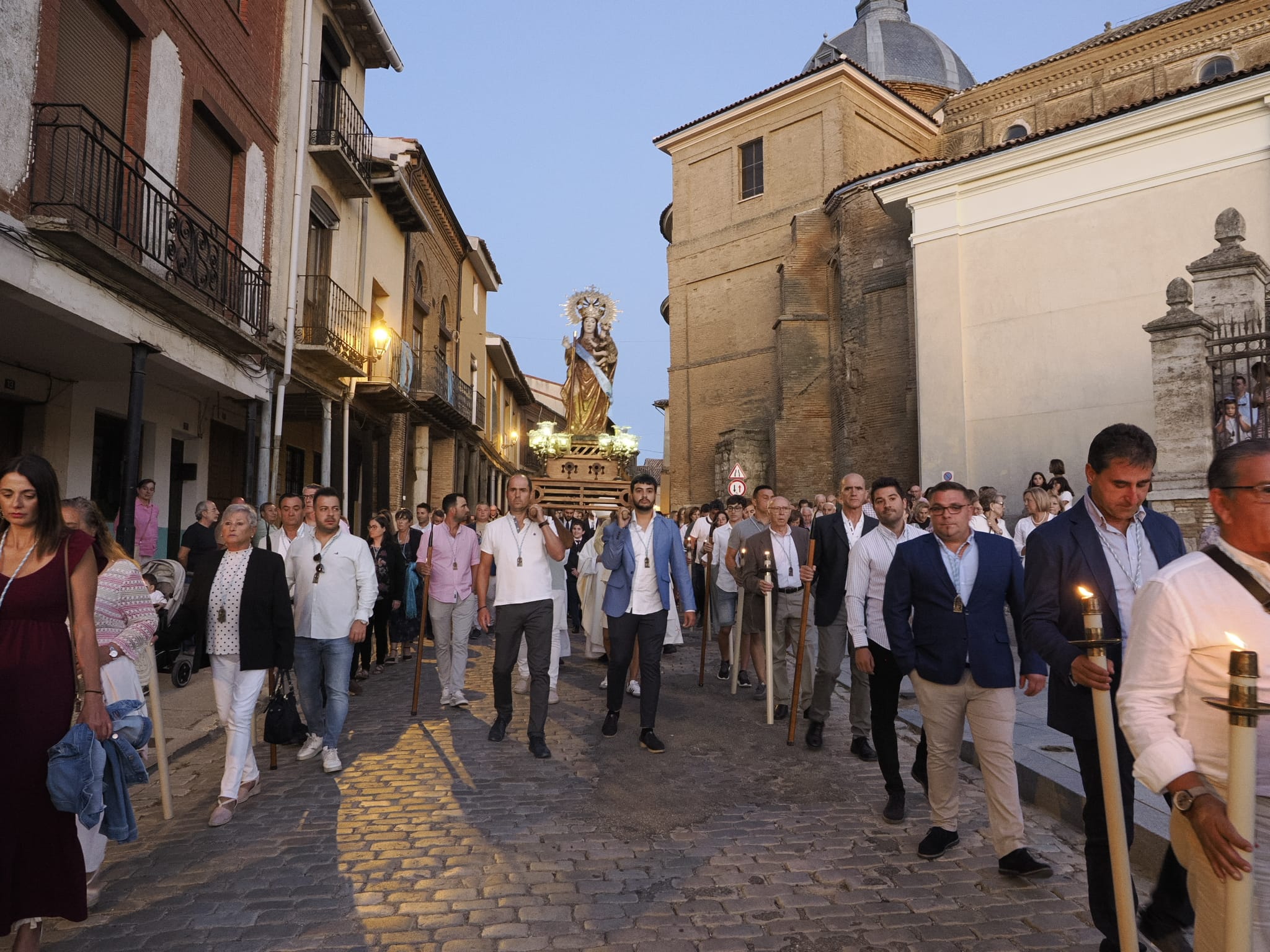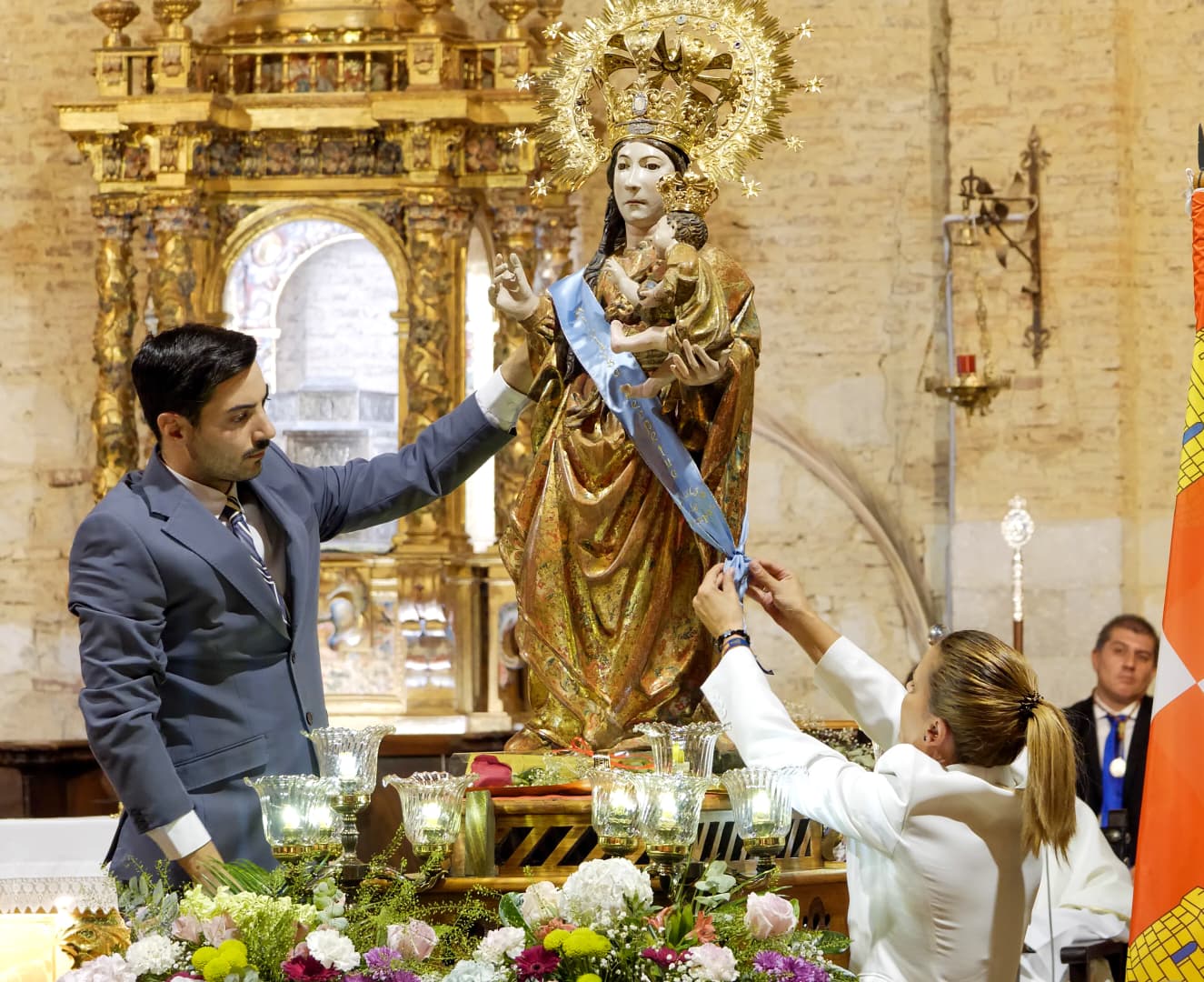 Así lo había acordado la Corporación Municipal el 22 de septiembre de 2023, cuando por unanimidad le otorgó este título honorífico. Y los fieles villaloneses estallaron en aplausos cuando casi dos años después, finalizada la Eucaristía que presidió el Arzobispo de Valladolid, don Luis Argüello, en la Iglesia Parroquial de San Miguel Arcángel la imagen fue revestida con una banda —también color azul— donde podía leerse “Alcaldesa Perpetua” y de manos del alcalde, José Ángel Alonso, recibía el bastón de mando antes de partir en procesión por las calles de la localidad, alumbrada por los hachones que la Cofradía Nuestra Señora de Fuentes mantuvo encendidos durante toda la celebración.